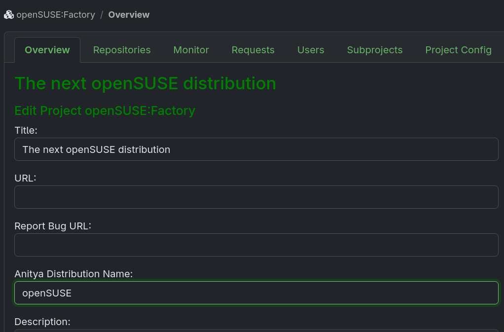 You need to be the project maintainer for every project in which you want to set this feature up. Open up the project and click the edit button. Modify the Anitya Distribution Name value to one of the distributions listed in the Release Monitoring Distribution List. Follow Section 13.1.2, “Which Distribution Is Right for Me” if you are unsure which distribution to choose. If the appropriate Distribution doesn't exist, create it.